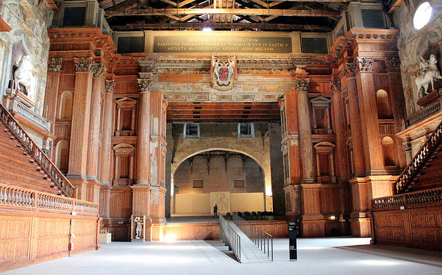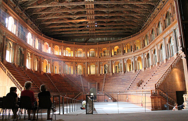 O teatro é daqueles lugares que te agarram de tal maneira que é complicado abandoná-lo. Obra do arquiteto e engenheiro hidráulico, Giovan Battista Aleotti. Para conseguir este efeito, ele utilizou madeira e gesso, que pintou para enganar teus olhos. Que no lugar do gesso veem mármore policromado e bronze.